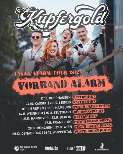 KUPFERGOLD nehmen auf ihre FASAN ALARM TOUR 2025 insgesamt drei Vorbands mit. Je gespieltem Konzert sind entweder KATERFAHRT, PUNCH DRUNK POETS oder BÜCHSENSPECHT am Start!