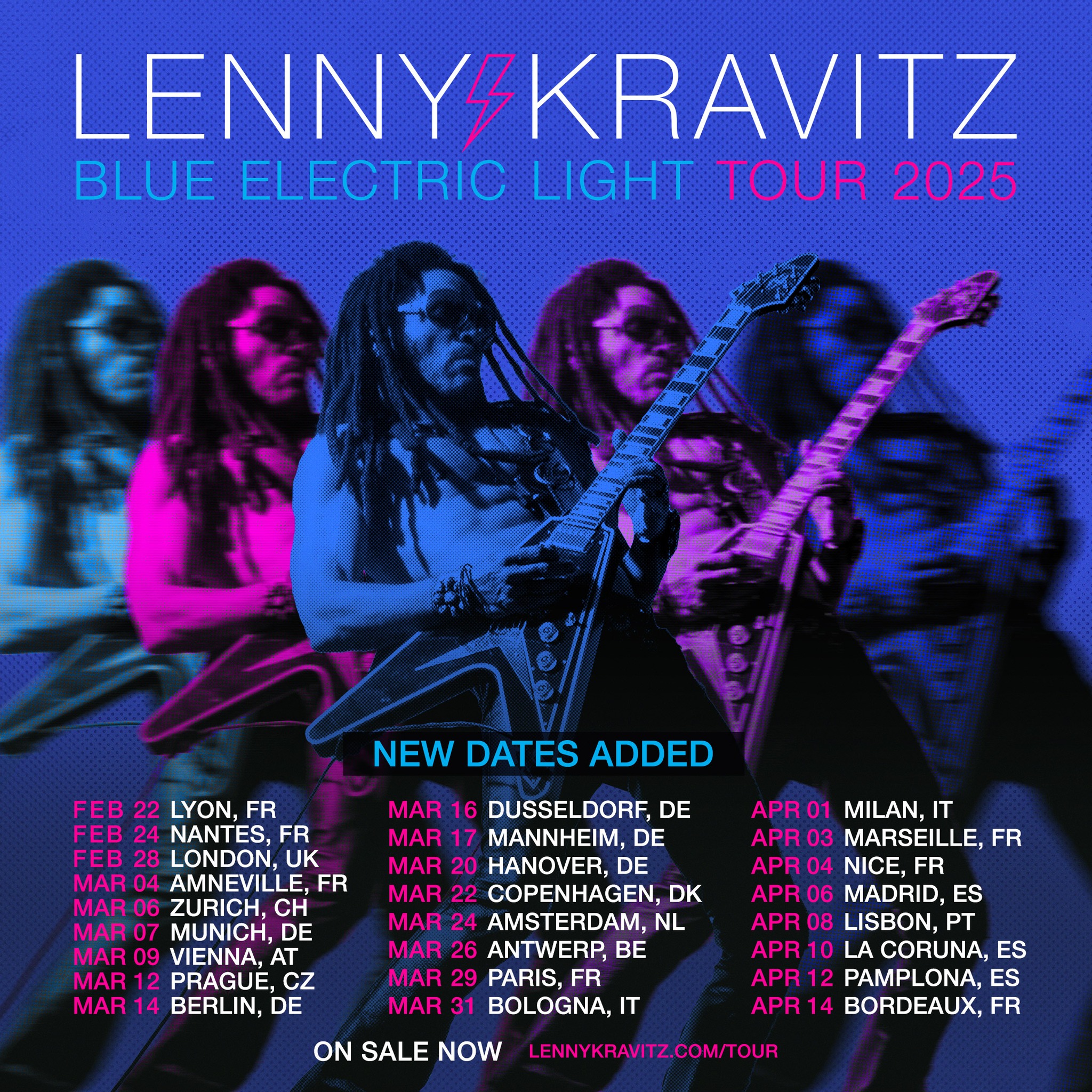Der Rockmusiker, Produzent und viermalige Grammy®-Gewinner Lenny Kravitz hat neue Termine für seine „Blue Electric Light“-Tour bekannt gegeben. Dabei wird das Multitalent vom 22. Februar bis 14. April 2025 in den großen Arenen Europas auftreten. Insgesamt gibt es fünf Termine in Deutschland, München (07.03.2025, Olympiahalle), Berlin (14.03.25, UBER Arena), Düsseldorf (16.03.25, PSD Bank Dome), Mannheim (17.03.25, SAP Arena) und Hannover (20.03.25, ZAG Arena).
