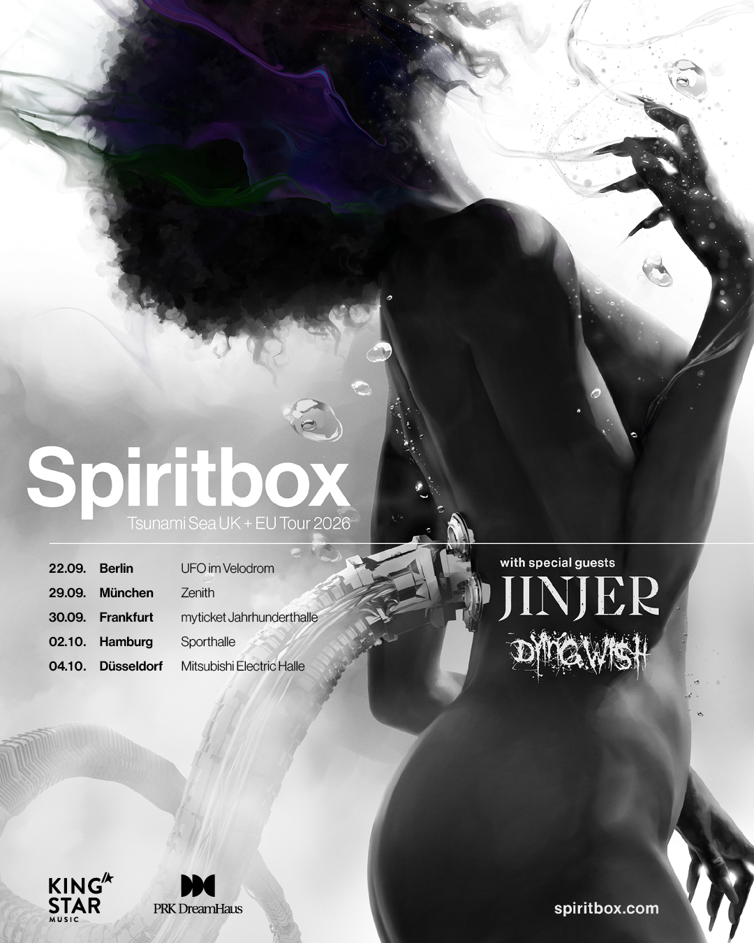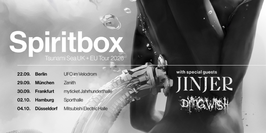 SPIRITBOX gehen im Herbst 2026 erneut auf Europatour. Im September und Oktober präsentiert die Band ihr aktuelles Album „Tsunami Sea“ im Rahmen ihrer bislang umfangreichsten Headline-Termine in Deutschland. Mit JINJER steht ein profilierter Vertreter der europäischen Metal-Szene als Special Guest auf dem Tourplan. Den Auftakt der Abende übernehmen DYING WISH.