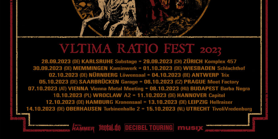 Dieses Jahr geht das Ultima Ratio Fest nach der erfolgreichen Ausgabe im vergangenen Jahr in die nächste Runde. Neben PARADISE LOST, PRIMORDIAL, HARAKIRI FOR THE SKY und OMNIUM GATHERUM sind auch wir als Präsentatoren wieder mit dabei. OMNIUM GATHERUM (Karlsruhe, Memmingen, Nürnberg, Saarbrücken, Hamburg, Oberhausen) und HARAKIRI FOR THE SKY (Wiesbaden, Hannover, Leipzig) werden sich von Show zu Show als Opener abwechseln. Es spielen alle vier Bands an allen Tagen, es geht hierbei nur darum, welche Band den Abend eröffnet.